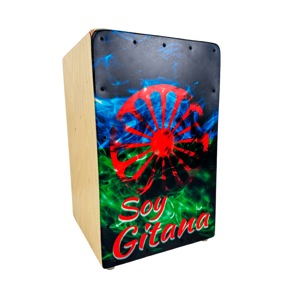 El Cajón Flamenco de Abedul con impresión de la Bandera Gitana es la elección perfecta.